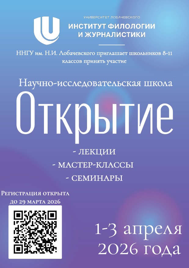 Институт филологии и журналистики Национального исследовательского Нижегородского государственного университета им. Н.И. Лобачевского (ННГУ) приглашает учащихся 8-11 классов принять участие в работе бесплатной научно-исследовательской школы «Открытие», которая состоится с 1 по 3 апреля 2026 года.