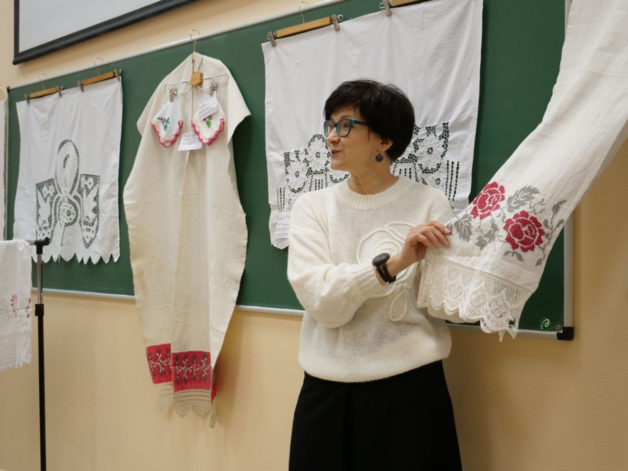 С мини-лекцией выступила руководитель Фольклорного центра Ю.М. Шеваренкова, рассказав об эстетической роли рушников в украшении дома к различным религиозным праздникам, символической функции рушников в структуре свадебной обрядности и о характерных вышитых узорах полотняной продукции. Ткачество, рукоделие – органичная часть традиционной женской крестьянской культуры, рассказ о которой дополняет знакомство студентов с русским фольклором. Выставка будет работать до конца декабря, посетить ее можно по расписанию работы Фольклорного центра в ауд. 124.