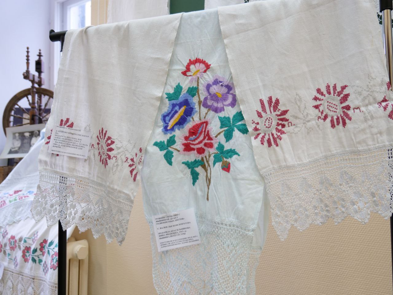 Демонстрируемые на выставке домотканые изделия ярко иллюстрируют сельский домашний быт и традиционное убранство крестьянской избы, которые в настоящее время представляет собой уже во многом ушедшую культуру. В коллекции представлены льняные вышитые рушники, подзоры, накидушки, занавески, привезенные студентами ИФИЖ из фольклорных экспедиций в Воскресенский, Дивеевский, Воротынский, Тонкинский и другие районы Нижегородской области. Большую часть коллекции составляют рушники, изготовленные девушками в качестве приданого на свадьбу.